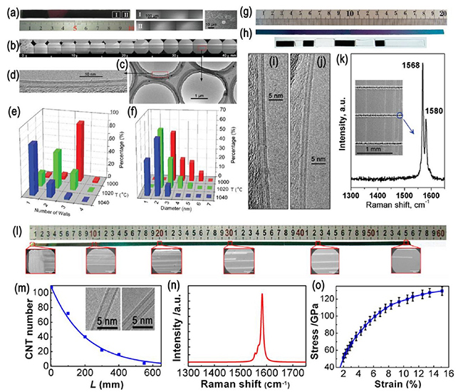 碳纳米管是由碳原子组成的管状结构纳米材料,具有优美的一维结构和优异的力学、电学、热学及光学性能,在微纳电子、透明显示、功能材料、能量存储、航空航天等领域具有广阔的应用前景。从1991年被发现以来,碳纳米管被广泛关注和研究,并实现了千吨级大批量制备。然而,由于制备工艺的限制,实际制备的碳纳米管通常存在大量结构缺陷,导致其实际性能远低于理论值。此外,实际制备的碳纳米管长度往往为毫米级,难以体现其优异力学性能,也难以在超强纤维、防弹衣、航空航天等高端领域得到应用。因此,可控制备宏观长度、结构完美的超长碳纳米管具有重要的学术意义和应用价值。