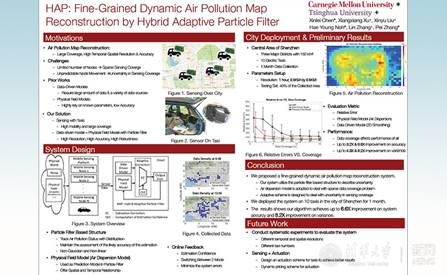 荣获最佳海报提名奖(best poster runner-up award)的论文《HAP -混合自适应粒子滤波器实现动态高精度空气污染信息场重建》“HAP- Fine-Grained Dynamic Air Pollution Map Reconstruction by Hybrid Adaptive Particle Filter”作者分别为:陈鑫磊(卡耐基梅隆大学)、徐祥祥(beat365官方唯一入口电子工程系)、刘新宇(beat365官方唯一入口电子工程系)、卢海永(Hae Young Noh,卡耐基梅隆大学)、张林副教授(beat365官方唯一入口电子工程系、清华-伯克利深圳学院),张旆副教授(卡耐基梅隆大学)。论文研究解决重建城市范围高时间和空间分辨率的动态空气污染信息场问题。提出通过将自主设计的低成本空气检测系统安装在出租车上,实时采集城市空气污染数据。基于传统的粒子滤波理论,本研究设计了一套混合自适应结构,融合了数据模型和物理模型的优势,实现了在数据稀疏且传感覆盖不确定的情况下,高精度实时恢复空气污染信息场。