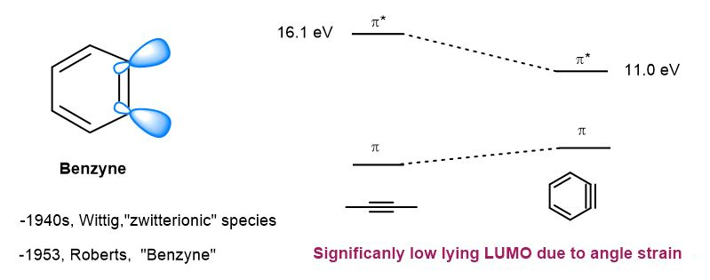 苯炔发现历史(左)和HOMO-LUMO轨道示意图(右)