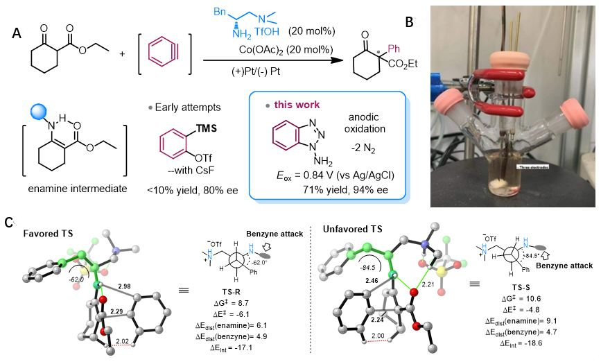 近几年来,电化学合成作为一种绿色高效的合成方法得到了飞速的发展。其中,极具挑战性的不对称电催化合成领域备受关注,成为合成领域的热门研究方向。最近,罗三中团队研究发现,在电化学氧化条件下,氨基苯并三唑可持续稳定的生成高活性苯炔中间体,并且该过程与不对称氨基催化过程具有较好的兼容性。结合团队自己开发的伯叔二胺型手性有机小分子催化剂,可以极高的对映选择性实现β-酮羰基化合物的不对称烯胺芳基化反应。该催化过程也可适用于原位生成环己炔中间体,从而可实现羰基化合物的不对称环己烯化反应。控制实验和理论计算表明,四水合乙酸钴作为添加剂可稳定苯炔并促进苯炔与烯胺的结合。针对对映选择性过程的理论计算探索表明,形成S构型产物的过渡态(TS)中烯胺中间体苄基部分需要有更大的扭曲来减少苯炔靠近时的位阻效应,从而使得形成R构型产物更有利。此外,反应可能经历协同C-C键形成和质子化叔胺N-H转移的过程,同样使形成R构型产物更为有利。该反应对于五元、六元环状β-酮酯,五元环状β-酮酰胺都能得到比较好的结果,并且对苯基取代的1-氨基苯并三唑和环己三唑也有很好的兼容性,以高对映选择性得到芳基化和烯基化的产物。