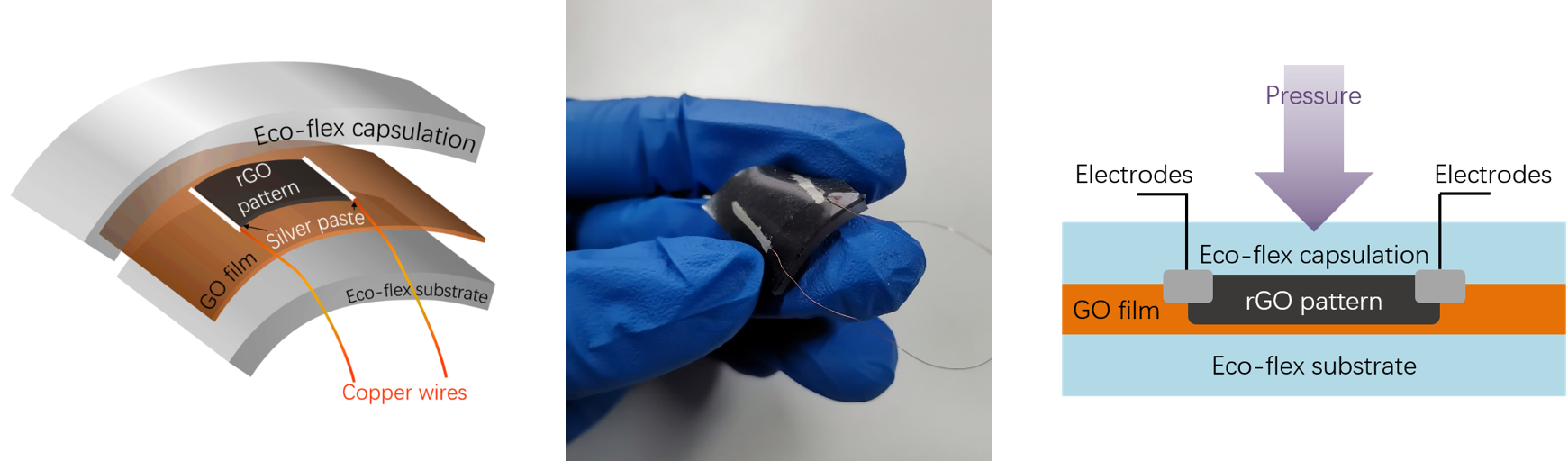 任天令团队基于激光还原石墨烯,将石墨烯与硅橡胶柔性基底相结合,制备了类三极管结构的石墨烯压力传感器,在整个量程区间内,传感器的灵敏度也随着压力增大而提高呈现指数变化趋势。将压力传感器受力端看做基极,模仿调节晶体管静态工作点的方式,通过调节力学静态偏置实现微小力学信号测量与放大。由于传感器核心采用了激光还原的多层石墨烯,在宏观结构上可被视为二维材料,器件总体呈现出正电阻变化的特性。同时还探究了图案、扫描角度等多种方法来增强和定制器件。除了贴附在手腕监测脉搏、贴附在胸口监测呼吸信号外,还能够在人体多处分别测量和还原血压值和波形。传感器的大量程还可以被运用于足底压力测量和步态监测,并组建了一个实时步态监测系统。