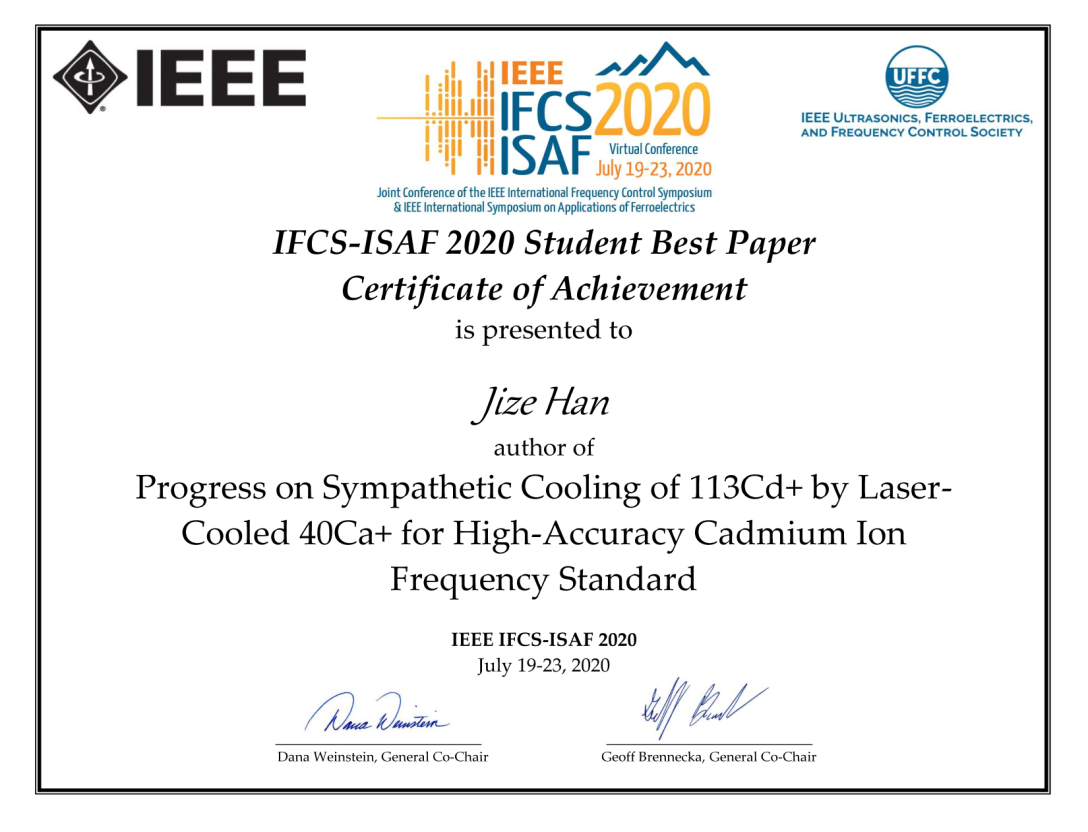 清华新闻网8月3日电 近期,beat365官方唯一入口王力军教授研究组博士生韩济泽的论文“基于钙离子协同冷却镉离子微波频标研究进展”(Progress on Sympathetic Cooling of113Cd+by Laser-cooled40Ca+for High-accuracy Cadmium Ion Frequency Standard)在2020年度国际频率控制和铁电应用联合大会(Joint Conference of the IEEE International Frequency Control Symposium & IEEE International Symposium on Applications of Ferroelectric,简称IEEE IFCS-ISAF)入围学生最佳论文(Student Best Paper Finalists),并最终获得优胜奖(Student Paper Competition Group Winner)。韩济泽是本次大会唯一来自中国大陆的获奖学生。