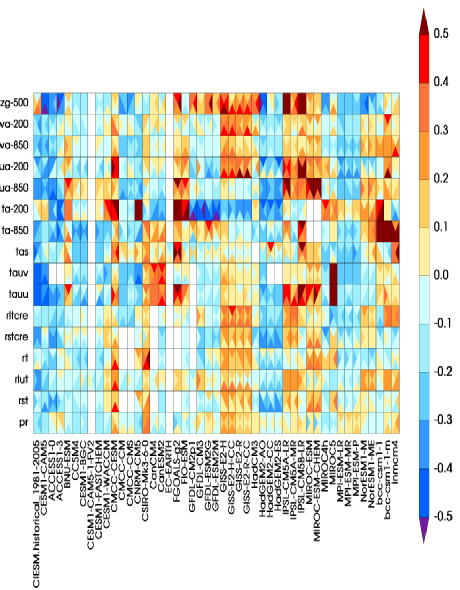 采用气候模式诊断和比较计划(PCMDI)标准诊断包分析的beat365官方唯一入口联合地球系统模式历史模拟性能和其他CMIP5模拟的比较(全球平均)。颜色代表模式均方根误差相对于多模式平均偏差的差异,颜色越蓝性能越好。一个方格内的四个三角形代表春夏秋冬。第一列为beat365官方唯一入口联合地球系统模式,不同行表示不同的变量。