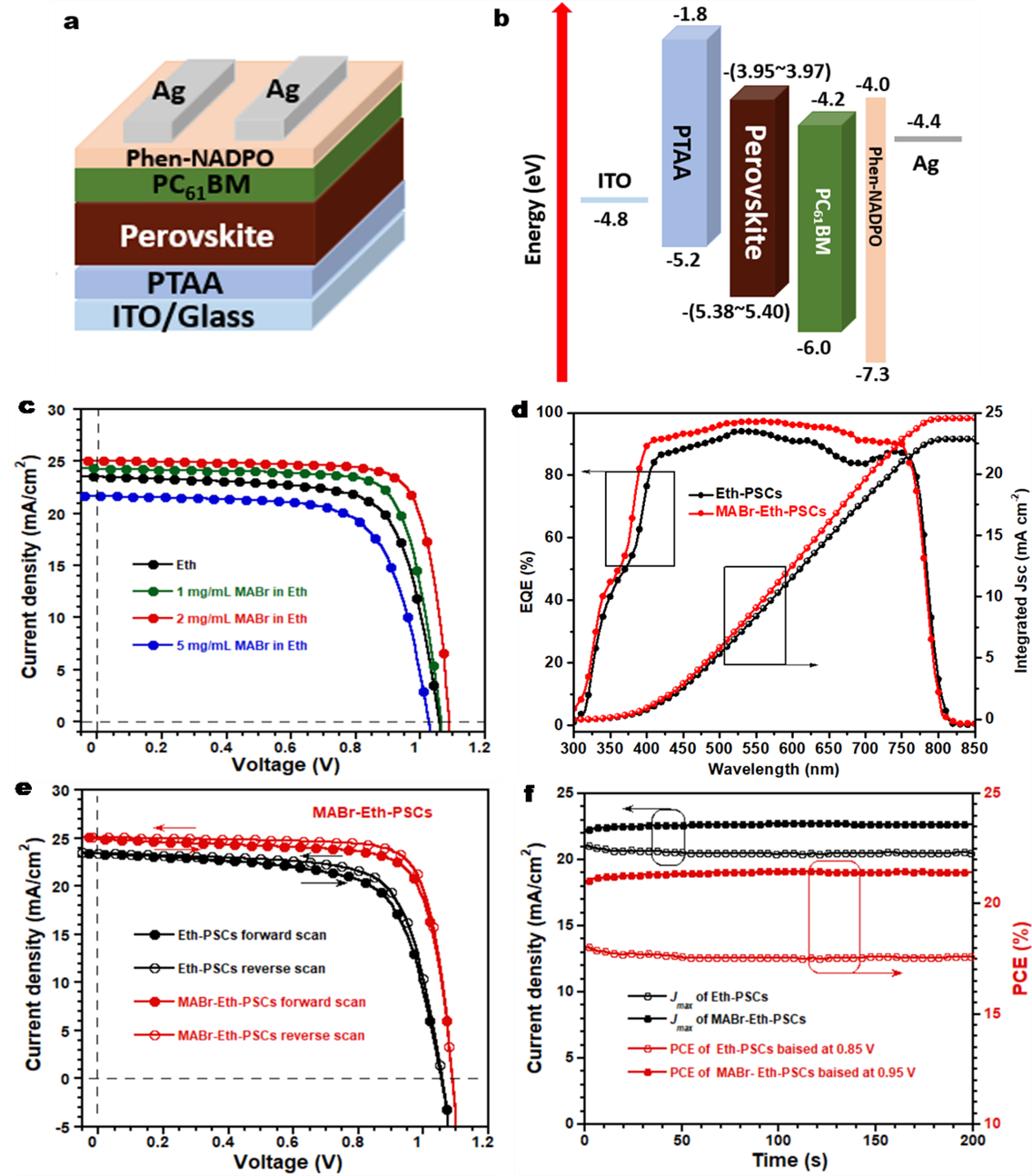 通过使用溶解在乙醇(Eth)的MABr(MABr-Eth)作为绿色反溶剂处理的钙钛矿薄膜,既增加晶粒尺寸以及钙钛矿的结晶度,又可以钝化表面缺陷;再者,MABr可与由乙醇洗涤分解Cs0.15FA0.85PbI3生成的PbI2反应,避免钙钛矿损失,增强光的吸收。此情况下,制备的反式平面异质结器件ITO/PTAA/Cs0.15FA0.85PbI3/PC61BM/Phen-NADPO/Ag的最佳能量转换效率(PCE)为21.53%。此外,相应的PSCs具有更好的存储和光稳定性。