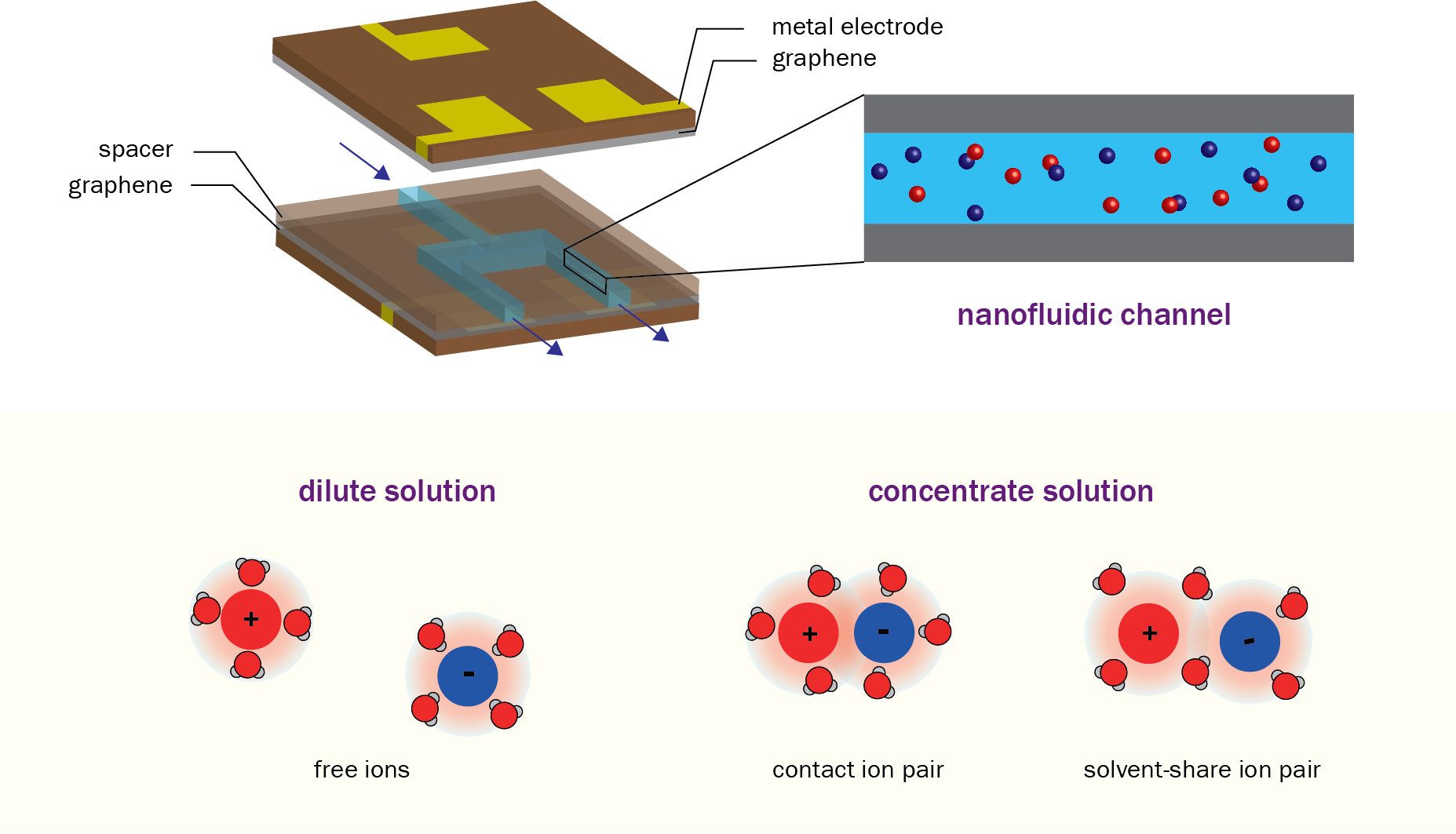 清华新闻网11月11日电 纳米机械器件可在原子尺度上实现信息存储、操控与通讯。然而,制备热力学稳定的状态,并实现低能耗的可控调制面临较大挑战。近年来,纳米加工技术的发展使得人们可以制备纳米,甚至原子尺度的通道结构并设计微流动器件。纳米尺度的限域效应使得流动器件的壁面效应更为显著:当器件尺寸降低至1纳米时,通道中的水在室温条件下将摈弃体相液体结构而展现出层状特性;当尺寸进一步降低时,可以观察到二维冰结构。在如此显著的限域效应下,通道中的离子水壳层结构亦将会受到影响,发生畸变,甚至破损。