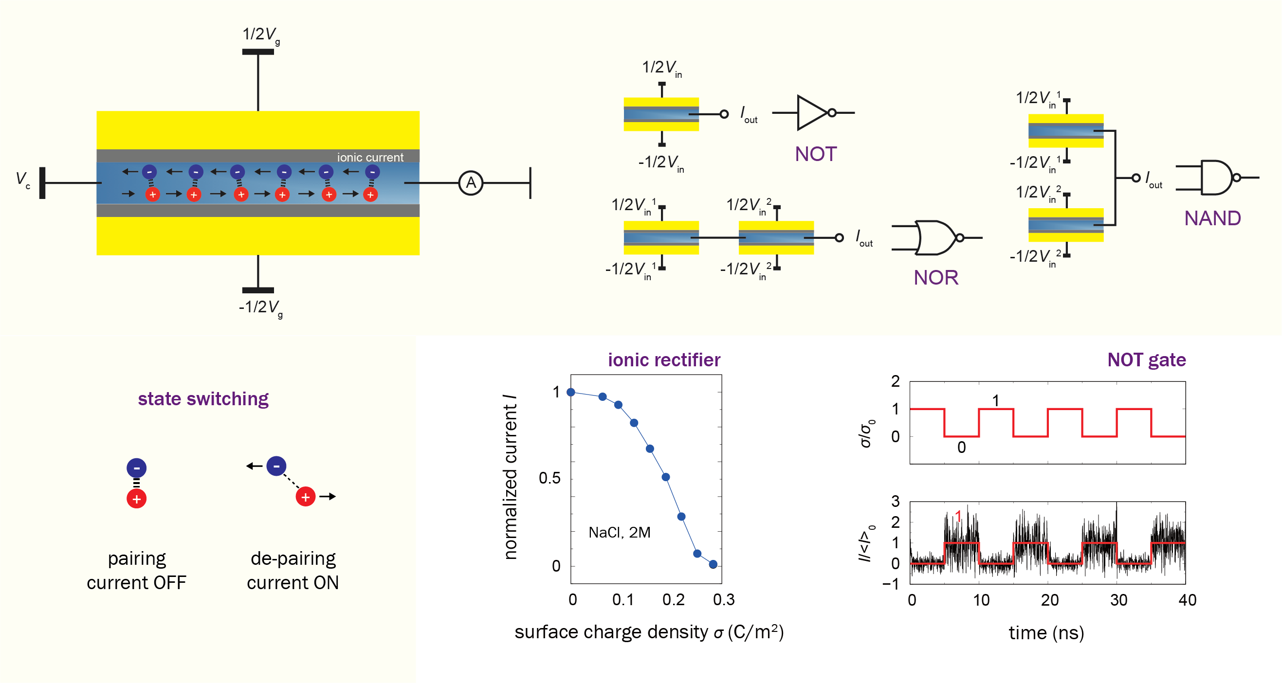 进一步,在驱动通道中溶液流动时,通过调控离子对构型的切换可实现基于纳米流动的离子开关、整流元件以及与、与非、或非逻辑门等基本单元,开展基于纳米流动的计算任务(图2)。纳米通道中离子对极短(原子尺度)的构型状态转变路径使得其切换操作仅需10-13秒,而不同构型间的自由能位垒与热涨落(kBT)相当,可以实现Brownian计算单元与极低能耗、高效逻辑的离子计算器件,探索其可逆极限。此外,自由能面的离子特异性还可以用于构建更多的离子关联状态。研究对于利用离子关联强度调控基于离子的质量与电荷输运也具有一定的参考意义。