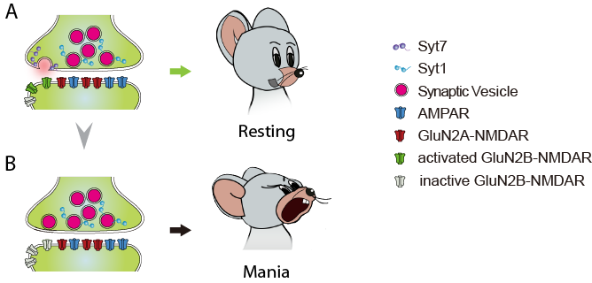 进一步,课题组以Syt7敲除小鼠神经元和躁郁症病人诱导多能干细胞分化神经元为模型,详细解析了Syt7与GluN2B-NMDAR之间的关系。课题组结合超高分辨率显微成像技术STORM和SIM、以及神经电生理技术,发现Syt7和GluN2B都位于突触的边缘活性区域(图一A),Syt7作为突触前的钙感受器所触发的神经递质释放能够特异、高效地激活突触后的位置相对的GluN2B-NMDARs;当Syt7缺失或发生功能障碍时,这一边缘区域的递质释放遭受阻碍,连带导致突触后GluN2B产生失活,从而发生抗抑郁效应,促使躁狂情绪发生(图一B)。本研究阐明了双相躁狂发生的机理,揭示了氯胺酮类药物对双相抑郁具有理想疗效的原因,论证了针对NMDAR进行药物研发可能是治疗双相障碍的较佳途径。