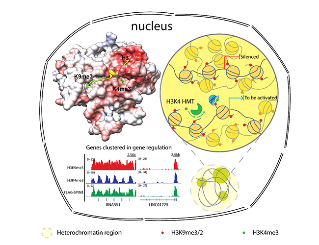 在胚胎早期发育细胞命运决定时期,H3K9me3介导的异染色质是细胞实现基因组重编程的主要“能垒”,研究人员认为,基因组重编程过程中,H3K9me3/2广泛存在的异染色质区域可以被H3K4甲基转移酶加上H3K4me3修饰,此时,组蛋白二价修饰H3“K4me3-K9me3/2”可以有效招募Spindlin1,进而使下游基因表达处于“暂停”状态,以便快速响应外界细胞分化或代谢信号。