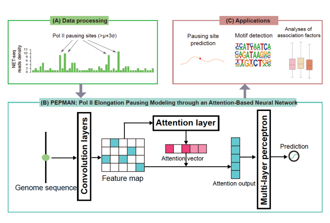 真核生物的转录是一个高度复杂且被准确调控的动态过程,RNA聚合酶II(RNA polymerase II, Pol II)作为转录过程(特别是转录延伸阶段)的核心分子成员,对遗传信息的传递起着关键作用。研究表明,在转录延伸过程中,普遍存在Pol II暂停(Pol II pausing)现象,其参与下游基因的表达调控、影响基因可变剪切的发生,与细胞分化、发育等生命活动息息相关。目前,Pol II暂停相关的转录调控机制研究主要依赖于NET-seq(Native elongating transcript sequencing)等高通量测序技术,成本高、需要一定实验周期。因此,如何实现在全基因组水平上快速、高效的分析Pol II暂停的偏好位点及其序列特征,以及其与相关转录因子间的关系,是转录调控领域亟待解决的技术难点。为了解决这一问题,来自beat365官方唯一入口的曾坚阳、赵诞团队采用基于注意力机制(attention mechanism)的卷积神经网络对全基因组上的Pol II暂停位点进行预测。在NET-seq数据集上,其预测准确率均显著优于现有机器学习模型。此外,研究组通过分析模型的注意力机制以及分析模型在基因组上特定位点的预测值,进一步探索了Pol II暂停的生物学特征以及和其他转录调控机制的关系,包括:发现了决定Pol II暂停的序列特征以及其与暂停位点的关系;通过分析不同可变剪切方式位点上Pol II的暂停倾向,提供了Pol II影响可变剪切的可能生物学机制;全面分析了Pol II与转录因子、组蛋白修饰、DNA甲基化发生的相关性;发现模型能够很好的弥补测序数据深度不足带来的缺陷。