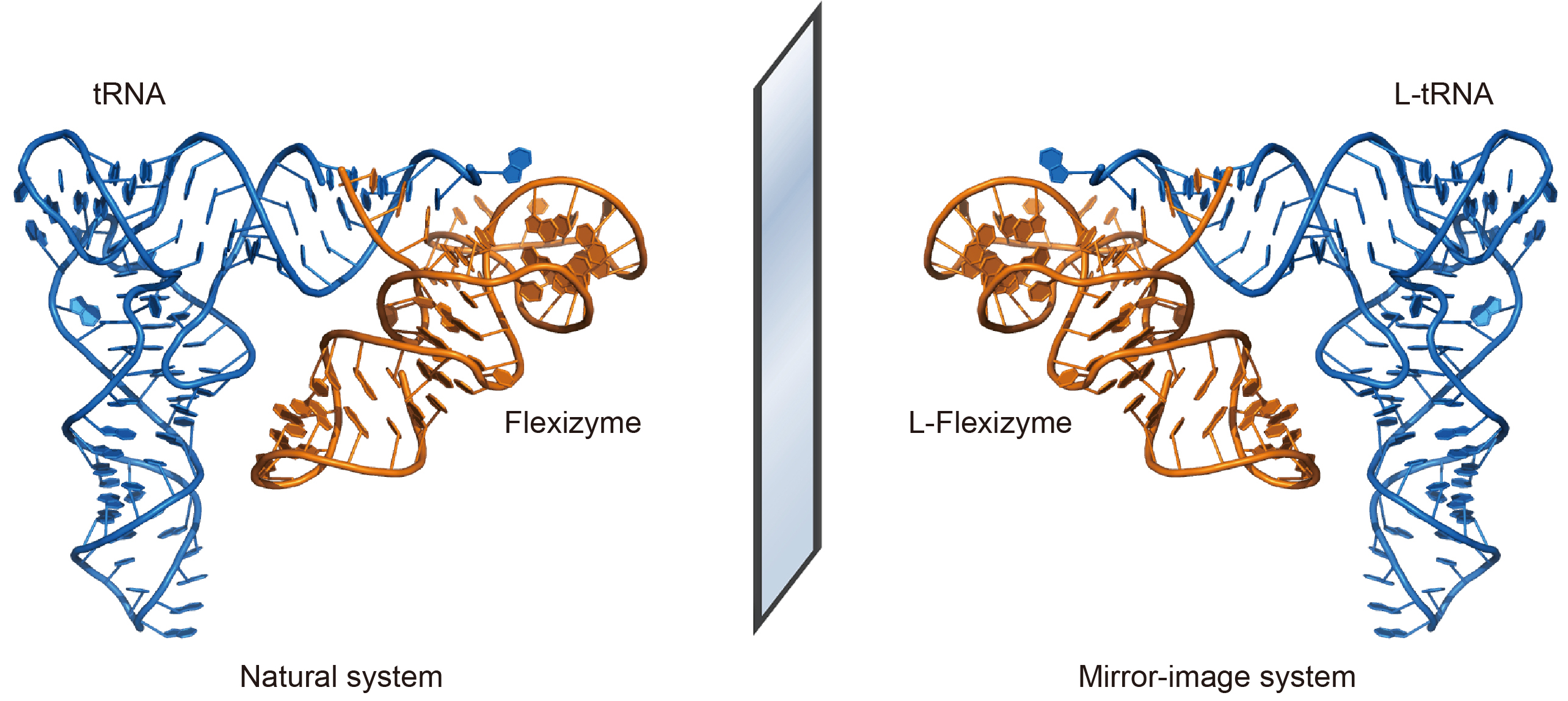 对tRNA进行氨基酸装载是蛋白质翻译过程的一个重要步骤。自然界中的tRNA氨基酸装载需要依赖一整套由数十种氨酰tRNA合成酶组成的复杂系统来完成。由于天然手性的氨酰tRNA合成酶无法识别并催化镜像tRNA氨基酸装载,而化学合成所有镜像版本的氨酰tRNA合成酶存在很大难度,因此如何找到一种适用于镜像tRNA氨基酸装载的方法是实现镜像蛋白质翻译必须解决的难题之一。虽然可对tRNA进行氨基酸装载的核酶Flexizyme早在2006年就已被发现,但由于翻译效率很低,不依赖氨酰tRNA合成酶的蛋白质翻译一直未被实现。同时,由于传统RNA化学合成技术的限制,全长镜像tRNA的合成效率与纯度都不高,无法被用于镜像氨基酸装载。