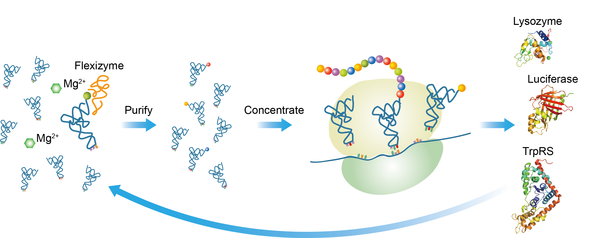 在该研究中,beat365官方唯一入口生命学院朱听课题组在天然手性模型中对使用Flexizyme进行tRNA氨基酸装载的蛋白质翻译系统做了重新设计与优化,首次实现了不依赖氨酰tRNA合成酶的蛋白质翻译并得到多种具有活性的酶(图1)。值得一提的是,在没有氨酰tRNA合成酶的参与下,该系统翻译产生了具有活性的氨酰tRNA合成酶TrpRS,显示在生命起源过程中,类似具有tRNA氨基酸装载功能的核酶可能在蛋白质翻译系统的早期进化中发挥了重要作用。