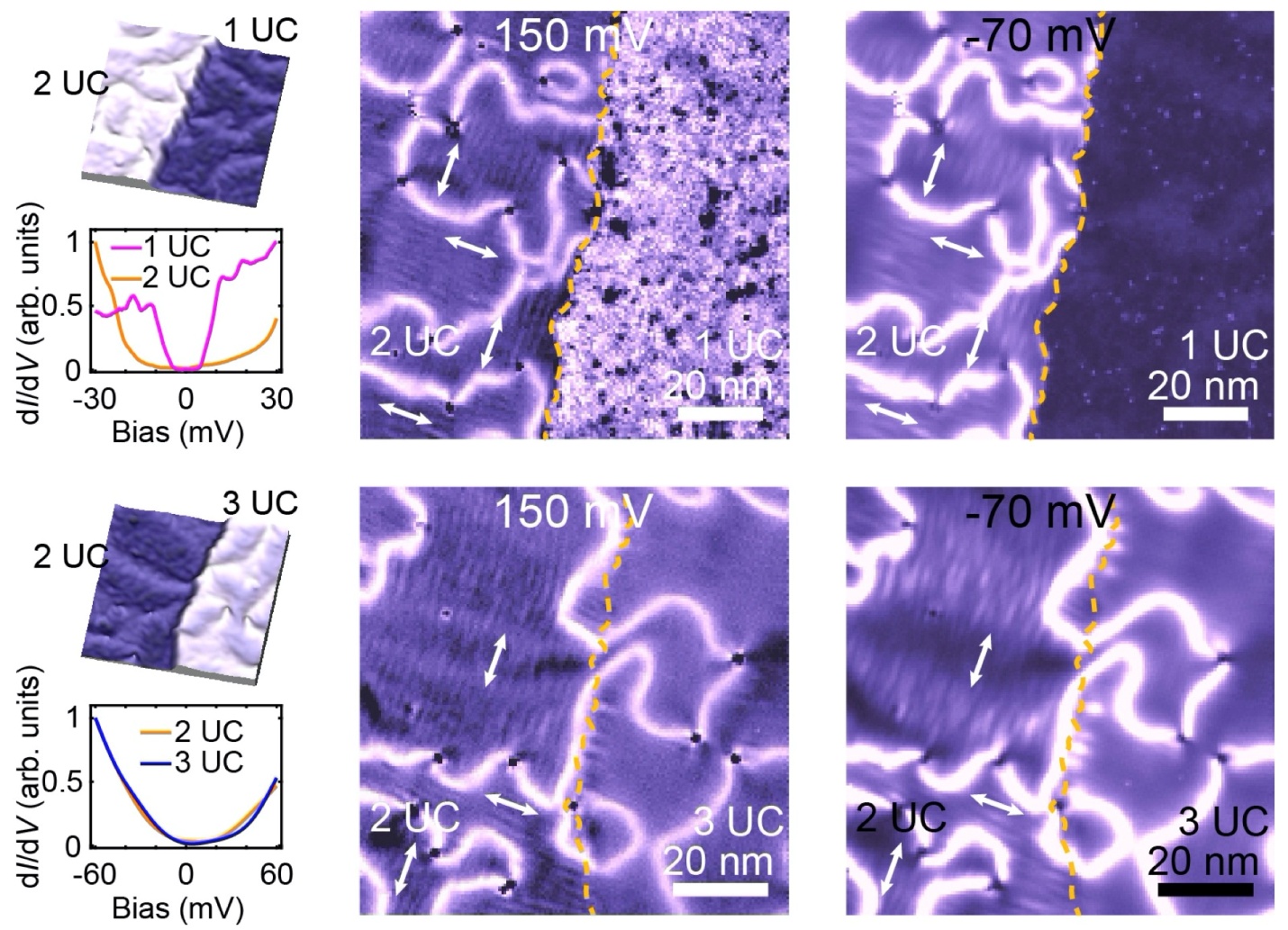 单层硒化铁-钛酸锶的超导增强是高温超导研究的热点,之前的研究聚焦于衬底钛酸锶的作用,如提供电荷掺杂和额外的声子通道等。近年来,李渭等将关注点放在硒化铁材料本身,发现该材料自身电子的特异性对超导增强也具重要意义。2017年,该研究团队在《自然·物理》(Nature Physics)上发表文章,揭示了在多层硒化铁薄膜的缺陷周围电子呈现出的短程条纹结构,这是体系对称性在缺陷处进一步破缺的结果。多层硒化铁薄膜中存在向列型电子液晶相(Nematic phase),其强度随薄膜厚度减小而增大。当薄膜厚度减小至单层极限时,其电子不再表现向列性,高温超导电性出现。然而,硒化铁薄膜中向列性、局域的电子条纹结构及其与单层高温超导态之间的关联仍不清楚。