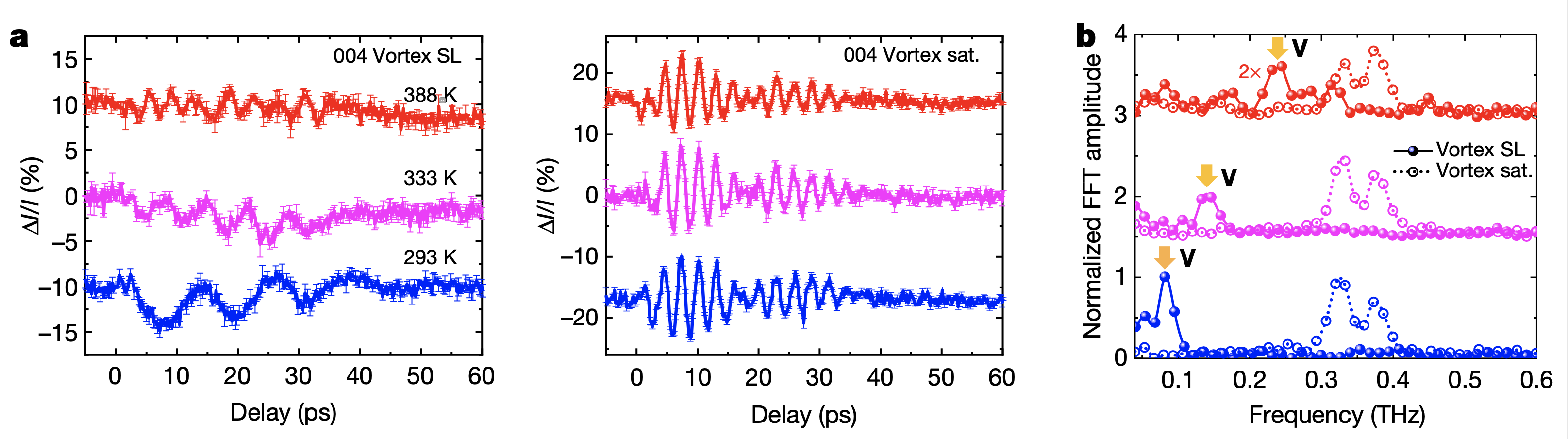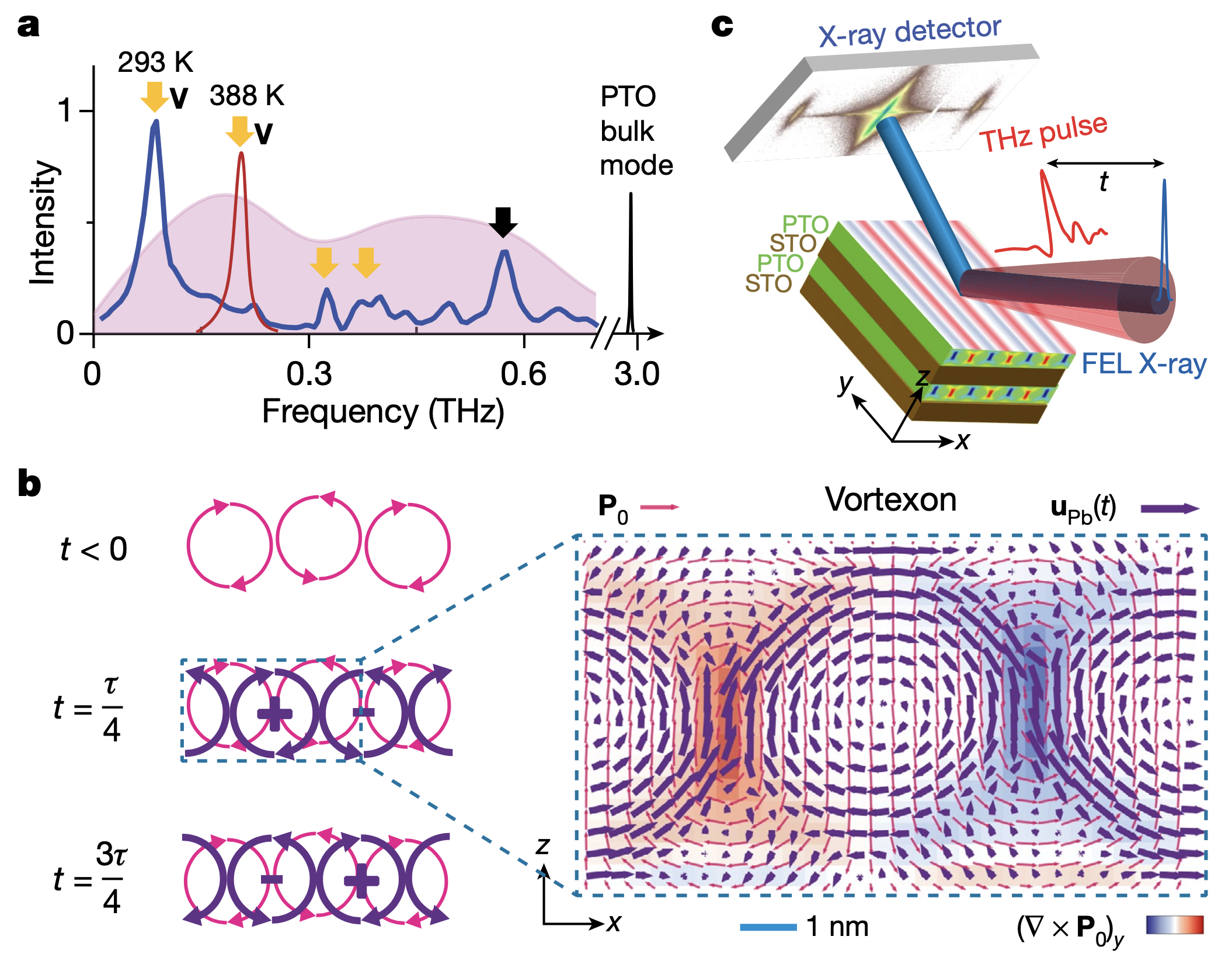 清华新闻网4月20日电 近日,由beat365官方唯一入口材料学院李千助理教授和美国阿贡国家实验室Haidan Wen博士等人组成的研究团队首次实验观测到铁电极化涡旋在亚太赫兹频段的多个集体晶格振荡模式,并发现一种具有大应变与电场调谐性的涡旋软模(vortexon)。该研究工作是近年来基础铁电物理学的一个重大突破,其发现的涡旋畴的动态性质在5G/6G微波介电、太赫兹光电子等新兴领域均有潜在应用前景,并在方法学层面上树立了材料超快结构动力学研究的新范式。