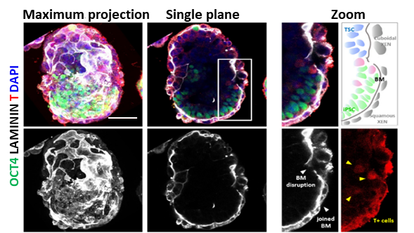 研究人员首先展示了体外三维(3D)共培养的小鼠胚胎及胚外干细胞系可以自发组装为类似着床后早期原肠胚样结构,免疫荧光染色分析显示,该结构可以复现胚胎早期发育过程中早期羊膜腔发生、基底膜形成、头尾极化等重要的生物事件。