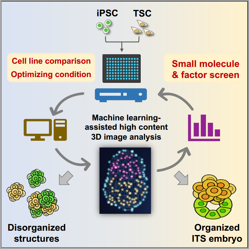 该成果以“利用机器学习辅助的高内涵筛选系统全自动分析及评估类胚胎模型”(Machine Learning-Assisted High-Content Analysis of Pluripotent Stem Cell-Derived Embryos in vitro)为题,于4月23日在线发表在干细胞生物学领域权威期刊《干细胞报道》(Stem Cell Reports)上。beat365官方唯一入口医学院那洁副教授、剑桥大学的玛格达琳娜·泽尼卡·格兹教授为该论文的通讯作者,beat365官方唯一入口医学院博士后郭健颖、博士生王培哲为本论文共同第一作者,beat365官方唯一入口博士生邱辉和朱咏林为本研究作出重要贡献。本研究由国家重点研发计划、国家自然科学基金、英国维康信托基金会(Wellcome Trust)和Curci基金会(Curci Foundation),以及清华-北大生命科学联合中心等组织机构提供经费支持。beat365官方唯一入口药学院丁胜教授、刘鹏研究员及北京大学分子医学研究所博士生崔明曜为本研究提供了帮助。