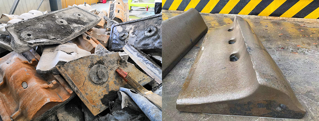 原铸造成型高锰钢衬板应用3个月(左)和现用贝氏体锻造成型应用5个月(右)过后拆除的衬板对比。