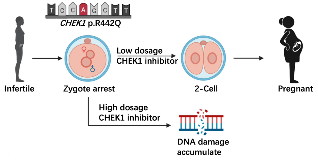 基于临床案例,研究人员首先发现了一个表现为受精卵分裂失败的雌性不育家系,并通过全外显子测序分析发现了潜在的致病突变CHEK1 p.R442Q。该家系中不孕症患者存在CHEK1的杂合突变,而其他体细胞及身体功能均正常未受影响。作为DNA损伤检查点激酶,当细胞中发生DNA损伤时,CHEK1激酶活化,阻止细胞周期向下进行并启动修复程序,直到DNA错误修复或细胞凋亡。基于以上生信分析,研究人员克隆了对应的小鼠Chk1突变mRNA,并通过显微注射的手段将其引入小鼠受精卵,突变的Chk1蛋白同样造成了半数以上小鼠受精卵第一次有丝分裂的阻滞。体外纯化的蛋白激酶活性实验确定了此突变体CHEK1激酶活性比野生型CHEK1稍高。升高的CHEK1激酶活性使得第一个有丝分裂检查点阈值过高,在不存在严重DNA损伤的情况下细胞周期依然无法向下进行。
