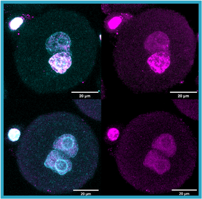 图1 小鼠正常合子(上)及p.R442Q突变型Chk1过表达合子(下)的免疫荧光染色。蓝绿色指示细胞核着色(DAPI);粉色显示DNA损伤标记蛋白(γ-H2AX)着色。p.R442Q突变型Chk1过表达的合子丧失发育过程中雄原核应有的DNA损伤标记。