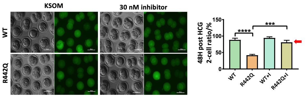图5 CHEK1抑制剂回复由CHEK1 p.R442Q突变导致的合子卵裂阻滞