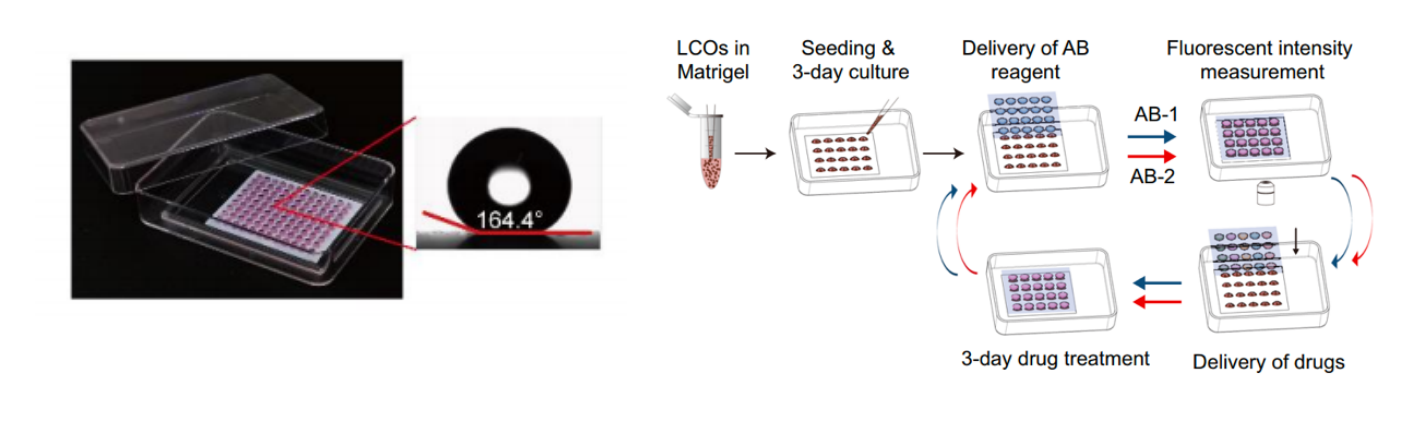研究中,作者将开发的InSMAR-chip用于LCOs的高通量三维培养和分析。该芯片具有通量高、体积小、节约样本和试剂并可进行实时追踪和寻址的特征,其表面由于注入了超疏水涂层,使得微孔之间具有物理隔绝,保证了每个微孔独立的液体环境,便于加样和换液的操作,此外,芯片微孔间距与1536孔板保持一致,更适配商用的成像及检测仪器。