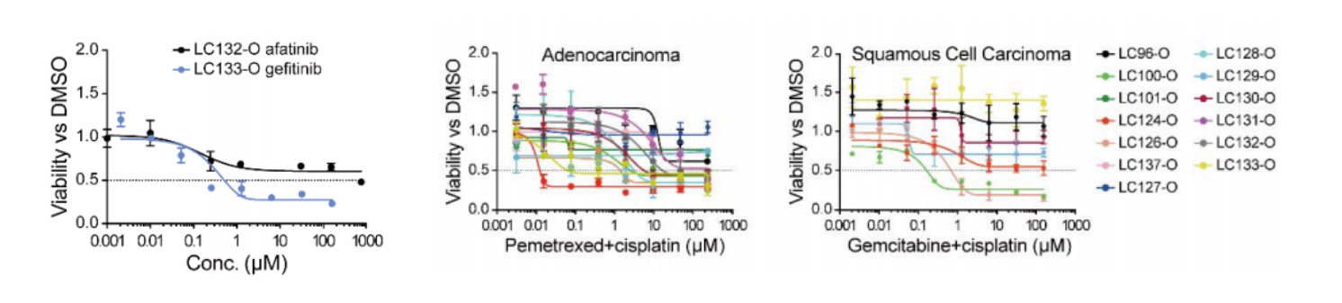 图5. EGFR突变型LC132O和EGFR野生型LC133-O拟合的剂量-反应曲线提示两例肿瘤对靶向药物敏感性的差异,与临床结果非常一致(左);肺癌类器官对顺铂化疗的异质性反应(右)