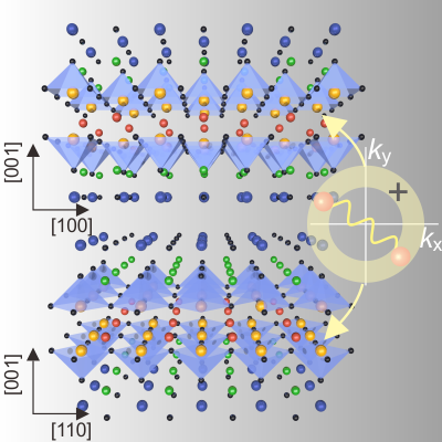 图1 高温超导转角约瑟夫森结原子结构示意图。图中蓝、绿、红、黄、黑色小球分别代表铋、锶、钙、铜、氧原子。上半部分半个原胞相对下半部分旋转45度。右侧插图表示s波配对中相位在空间中保持相同符号。