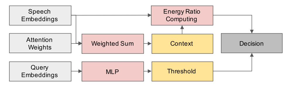 课题组首先根据注意力权重对语音特征进行加权求和从而得到上下文特征。接着,通过计算上下文特征和语音特征的能量比。最终,课题组将能量比和由文本特征经过多层感知机得到的门限进行比较从而得到最后的判决结果。
