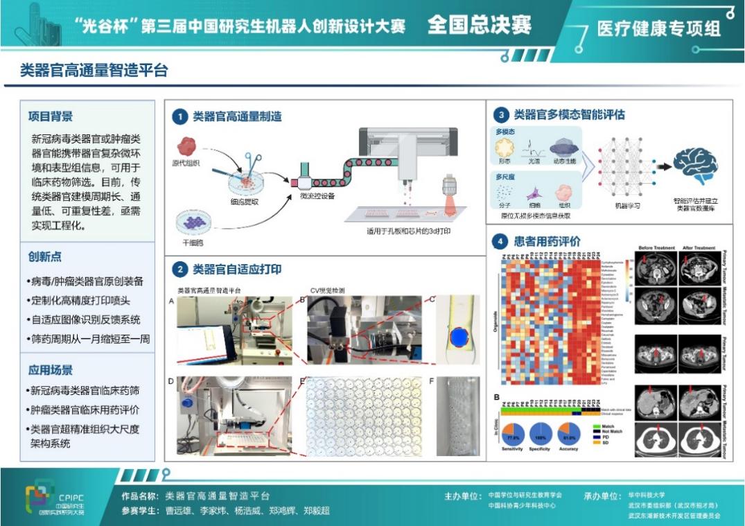 本参赛项目团队设计开发出了一种高通量、自动化、标准化的基于微流控的类器官制备系统,可以实现微升级的精准液体操控,在新冠肺炎药物筛选、癌症精准个体化医疗方面已经取得重要进展。从病人活检样本到个性化类器官制备完成所需要的时间由之前的数小时提升至几分钟,并且完全排除人为干预,减少了操作失误。本系统的制备速度也是目前已知最快的,这是癌症精准治疗领域的重要突破。