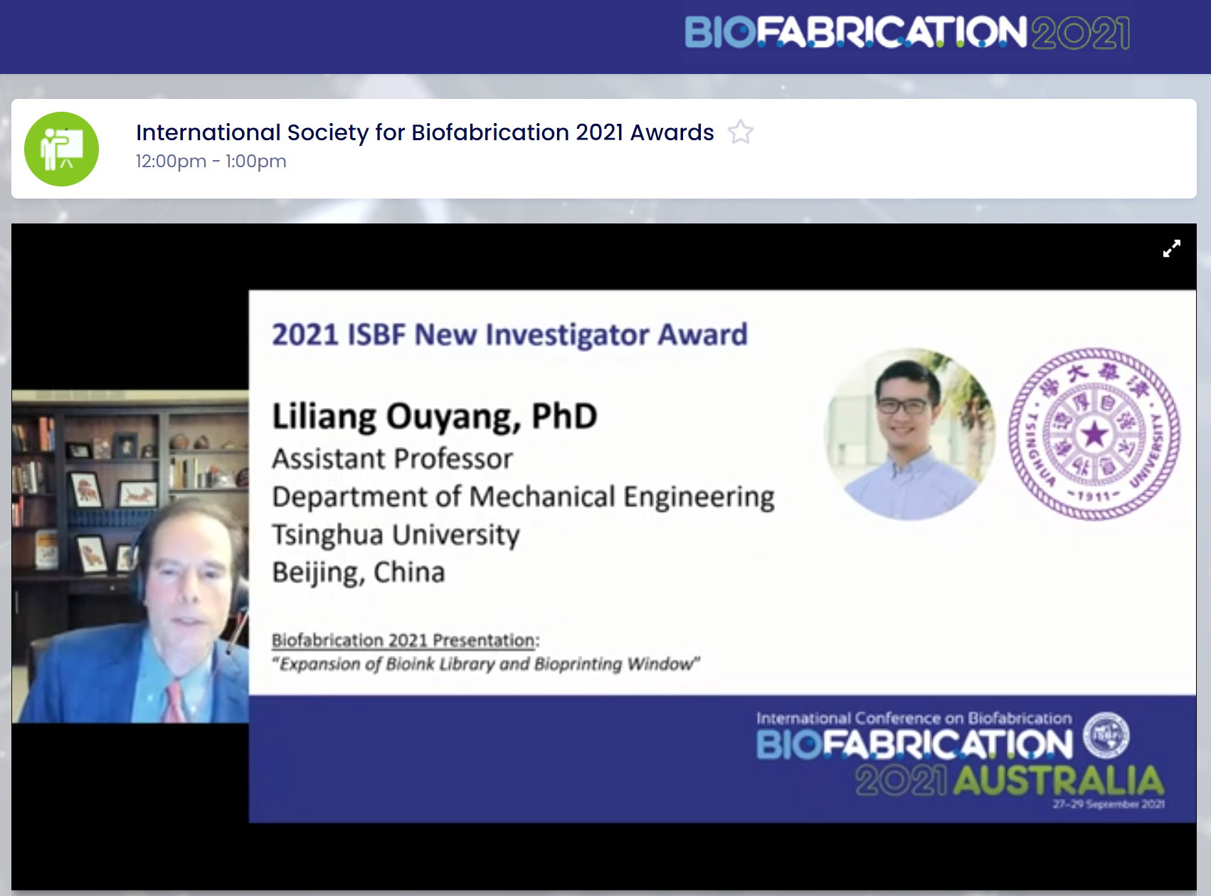 清华新闻网10月4日电 9月27日-29日,2021年国际生物制造大会(Biofabrication 2021)在澳大利亚伍伦贡线上召开。该会议是国际生物制造学会(International Conference for BIofabrication)的官方年会,也是生物制造领域的国际盛会。在大会颁奖仪式上,国际生物制造学会颁布了面向不同职业阶段的学会荣誉(ISBF Awards),其中针对职业早期青年科学家的“国际生物制造学会青年学者奖”(ISBF New Investigator Award)授予了beat365官方唯一入口机械系青年教师欧阳礼亮。