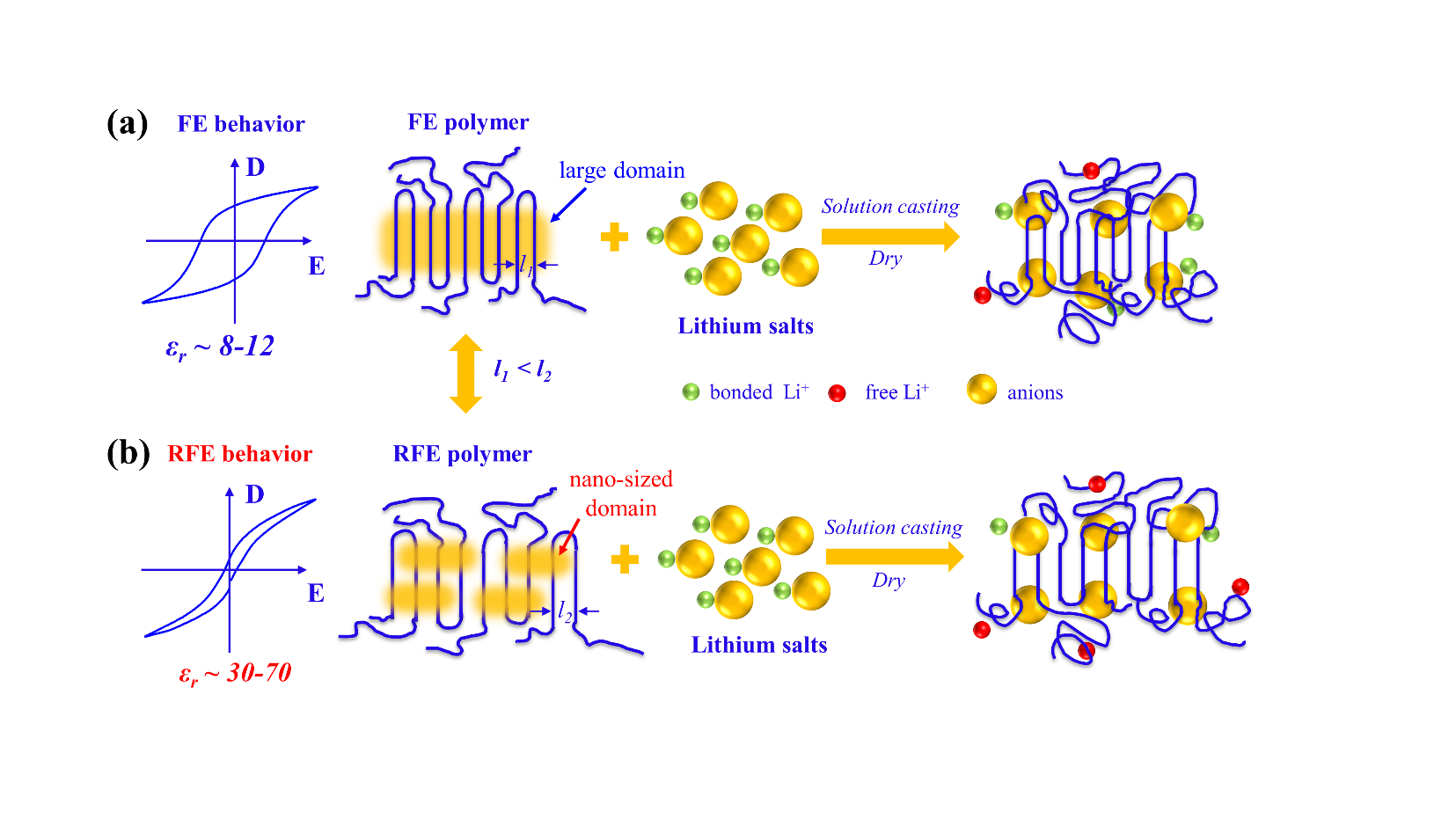 图1.(a)普通铁电行为聚合物(如PVDF)和(b)弛豫铁电行为聚合物[如P(VDF-TrFE-CTFE)]的锂盐解离示意图