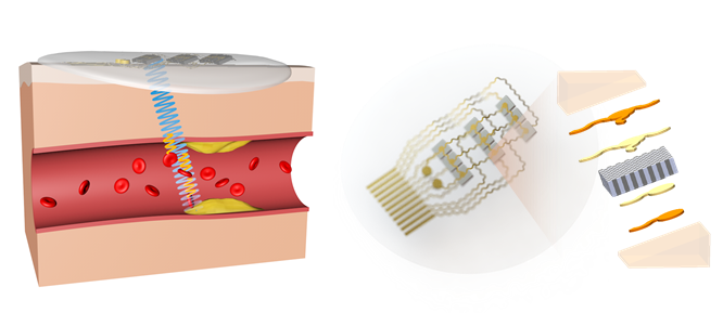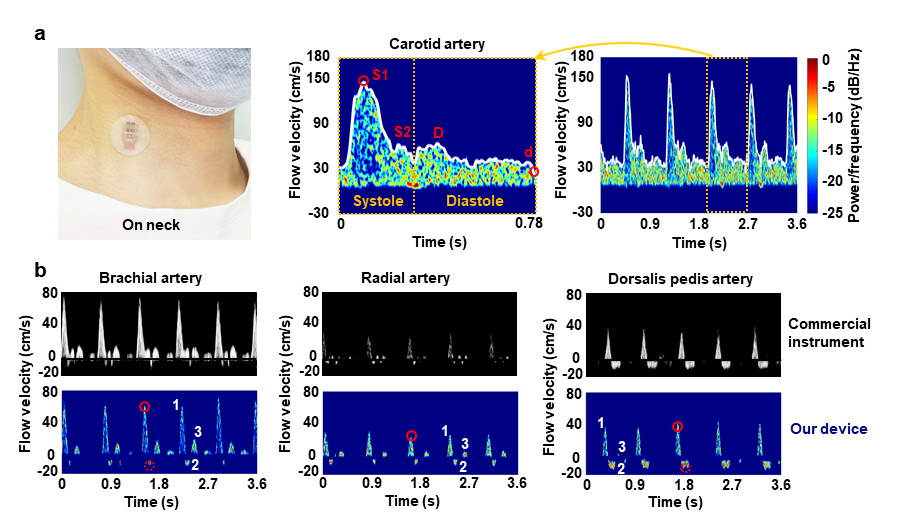 清华新闻网10月29日电 心血管疾病是全球第一大死因,据世界卫生组织预测,到2030年将有约2360万人死于心血管疾病,长期连续监测血流速度对心血管疾病防治具有重要意义。例如,颈动脉在高血压、高血脂等因素作用下往往会出现一定程度的硬化而形成硬化斑块,容易引发脑卒中危险,准确判断管腔狭窄程度是预警斑块脱落和防治脑卒中最重要的方法之一,但当前可持续监测血管狭窄状况的技术手段十分缺乏。基于光容积描记术或热分析的技术只能提供相对的流量变化,探测深度很浅;而传统的超声设备体积大、材质刚性,存在固定困难、接触变形大、无法与人体表面良好耦合和难以连续监测等缺点。
