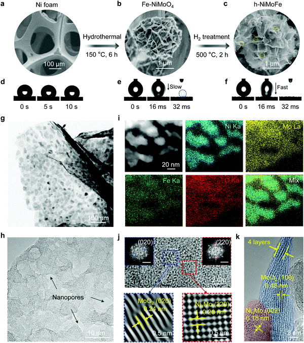 研究人员采用水热反应结合高温热还原的两步法制备出h-NiMoFe催化剂。首先,该催化剂具有三维多孔结构,保证了催化剂在大电流条件下能够与电解液充分接触。其次,结合原位X-射线吸收谱和准原位X-射线光电子能谱,研究人员发现催化剂中的钼和铁显著调控了镍位点的电荷分布,提高了镍的价态。第三,催化剂的表面化学特征也发生改变,被钼和铁修饰同时的镍基催化剂表面具有高羟基化的特征。进一步的密度泛函理论计算表明,铁物种改变了镍位点的d-带中心位置,优化了其氢吸附自由能。同时,碱性环境下氢析出反应的水解离步骤也得到优化,以上催化剂微纳结构、活性位点的电荷分布和化学组分等因素综合起来,使h-NiMoFe具有优异的电解水氢析出性能。