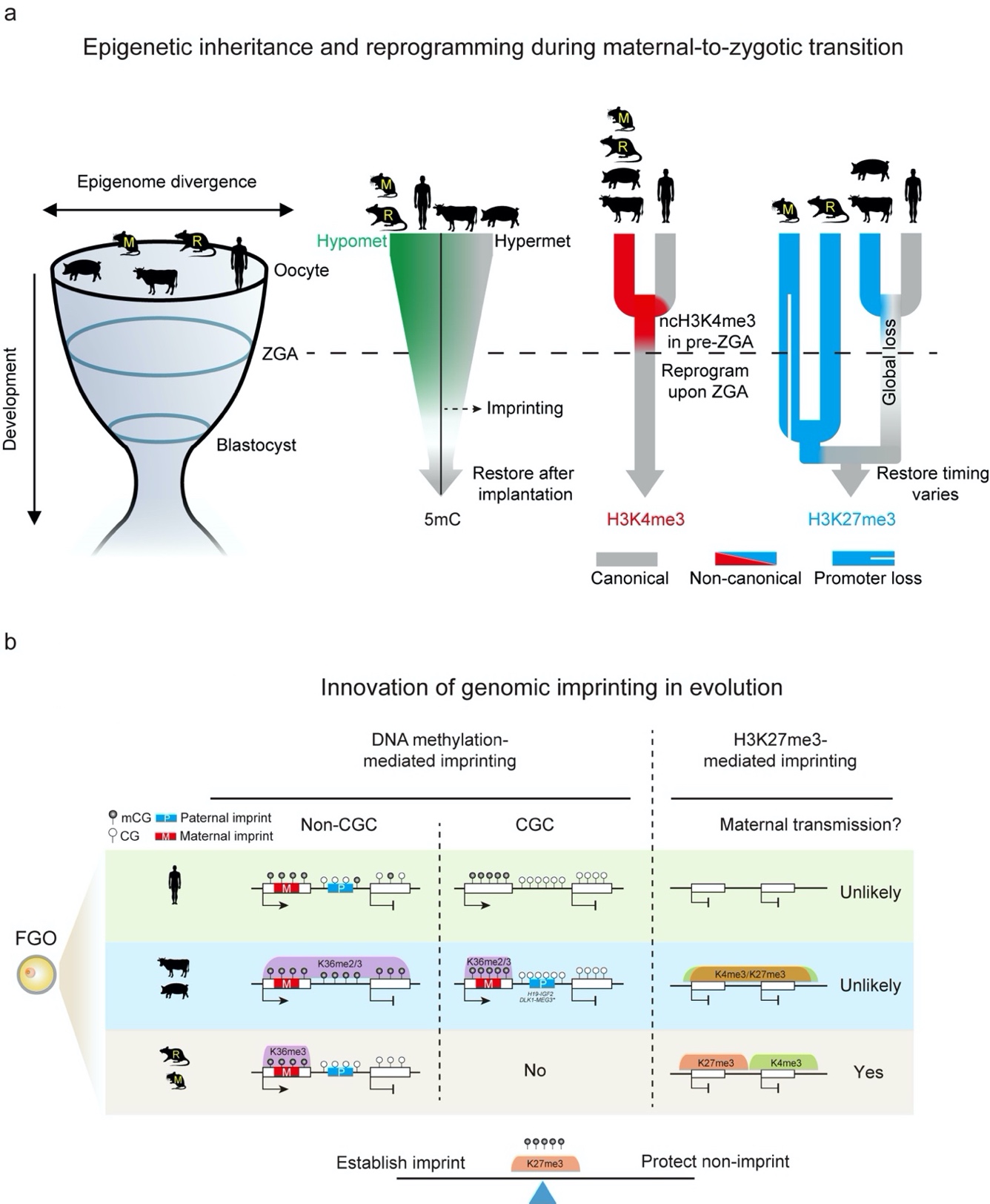 哺乳动物早期胚胎发育中表观遗传重编程和基因印记的的保守性和物种特异性。a,卵母细胞的DNA甲基化(人、牛和猪中较高,啮齿类中较低)在哺乳动物早期胚胎发育过程中经历了整体的去除,但基因印记区能够很好维持DNA甲基化。非经典模式的H3K4me3和H3K27me3存在于除人以外的所有物种中,但只有啮齿类卵母细胞中的H3K27me3可以遗传至ZGA之后。b,卵母细胞中的DNA甲基化(包含母源印记)与H3K36me2和H3K36me3高度相关;父源印记存在于不转录的基因间区(牛和猪中主要在CGC区域)。H3K27me3介导的基因印记主要存在于啮齿类动物中。H3K4me3和H3K27me3在牛和猪的卵母细胞中可以共存,但是在啮齿类动物中彼此大致分布在不同区域。卵母细胞在印记区的建立和非印记区的保护之间实现了精细平衡。