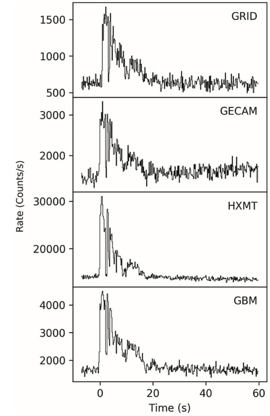 伽马射线暴GRB 21021A的光变曲线。从上至下分别为天格GRID-02星、怀柔一号(GECAM,极目)卫星、慧眼(HXMT)卫星,以及美国费米(Fermi/GBM)卫星的观测结果。取自Wang, X. I, et al, 2021, The Astrophysical Journal, 922, 237.