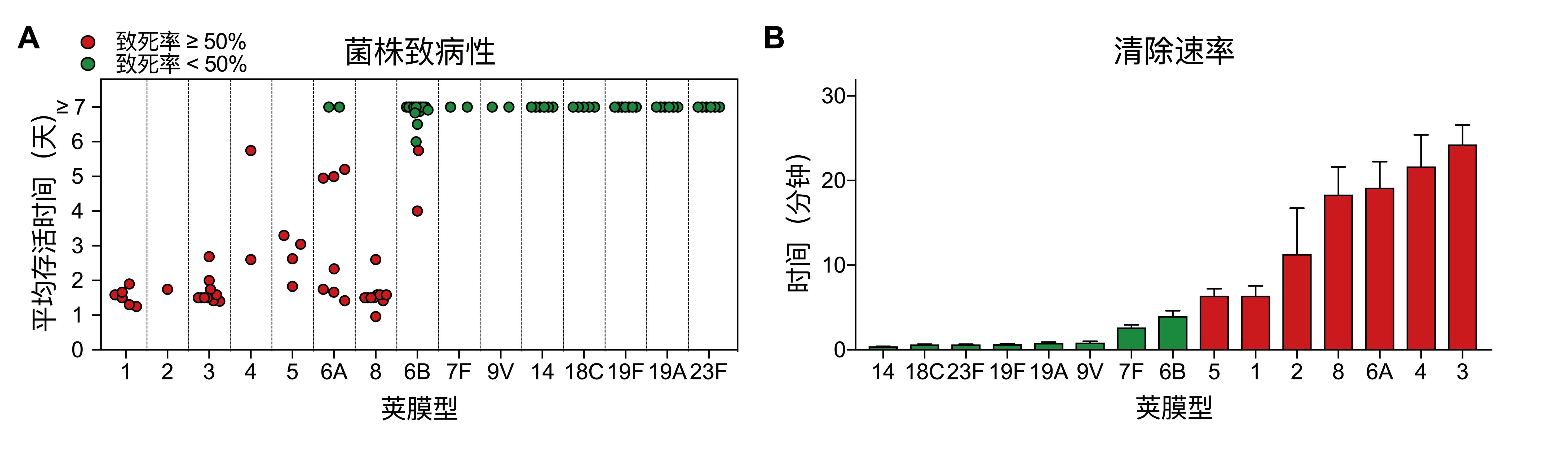 图1 肺炎链球菌荚膜血清型决定菌株的毒力水平和菌血症早期清除速率