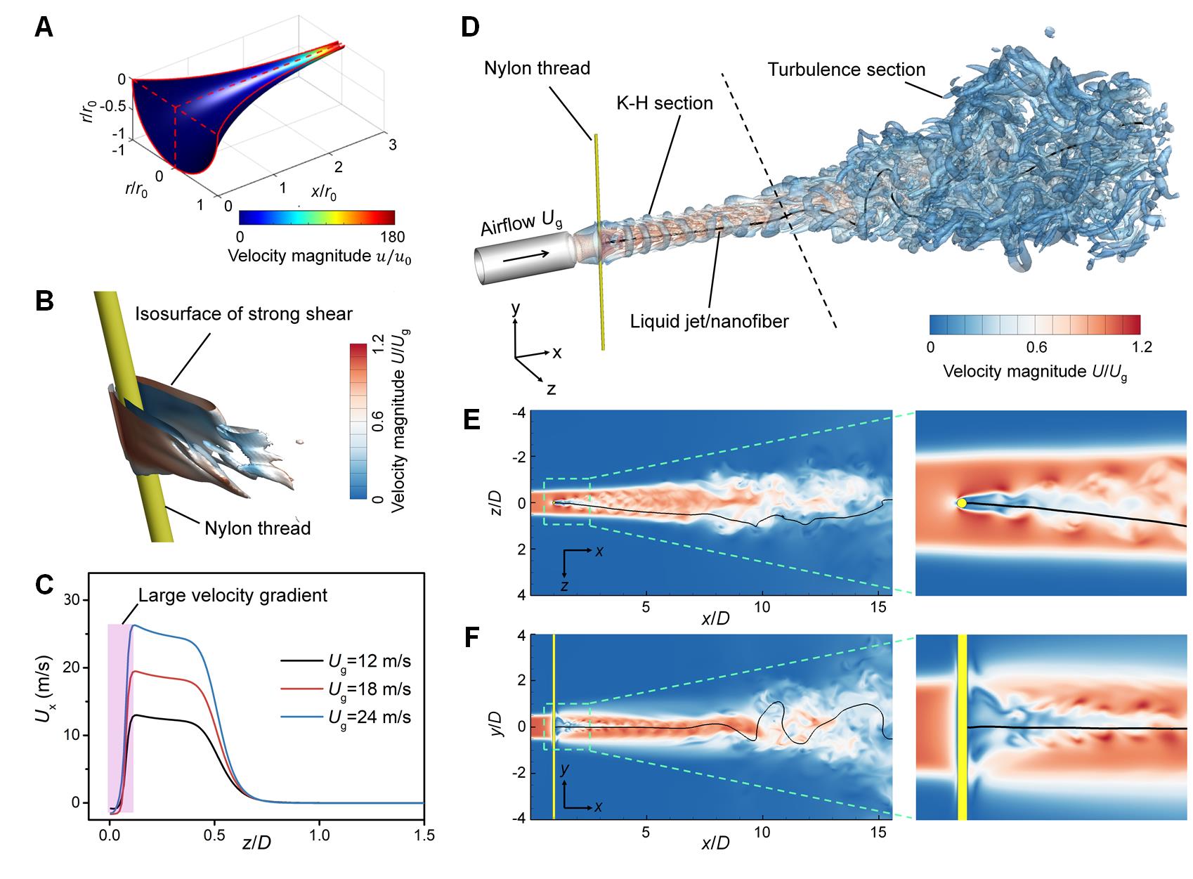 清华新闻网3月17日电 气相和液相高速流体之间的相互作用规律具有重要的基础科学意义;在实际生产中,气、液流的相互作用也具有重要应用价值,例如利用气流对液体溶液的高速剪切可以制备高性能纤维和粉体材料。在材料科学领域,纳米纤维具有独特的物理化学性质,成为最具吸引力的新型材料之一,在环境过滤、能源存储、柔性电子、组织工程和病毒防护等诸多领域发挥着日益重要的作用。为了实现先进纳米纤维材料的工业化应用,发展高通量、高效率、低成本、连续稳定的纳米纤维宏量制备方法具有重要的价值和意义。