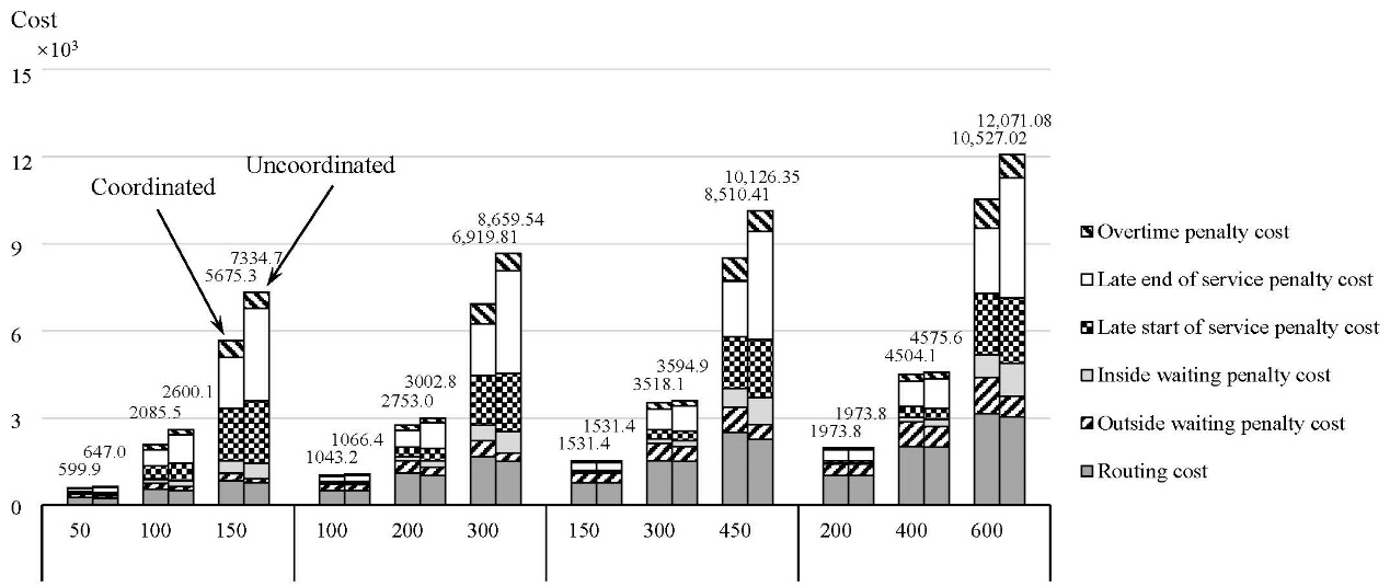 关于大型商场协同配送(coordinated delivery)的论文研究如何通过城市配送合作优化平台(Collaborative Urban Delivery Optimization, CUDO)对多个大型商场中的众多商户进行协同配送规划和商场卸货泊位预约。除商场卸货泊位约束外,论文还考虑了车辆行驶时间和卸货(及商场内配送)时间的随机性、配送车辆到达商场后的进入顺序和卸货服务顺序的实际运作规则,建立了两阶段随机混合整数规划模型,并设计了基于不同样本量的大规模自适应邻域搜索算法。论文通过基于新加坡实际数据的数值实验,展示了协同配送的价值和随机优化的价值(图1.展示了协同配送与非协同配送的总成本与分解成本的对比)。