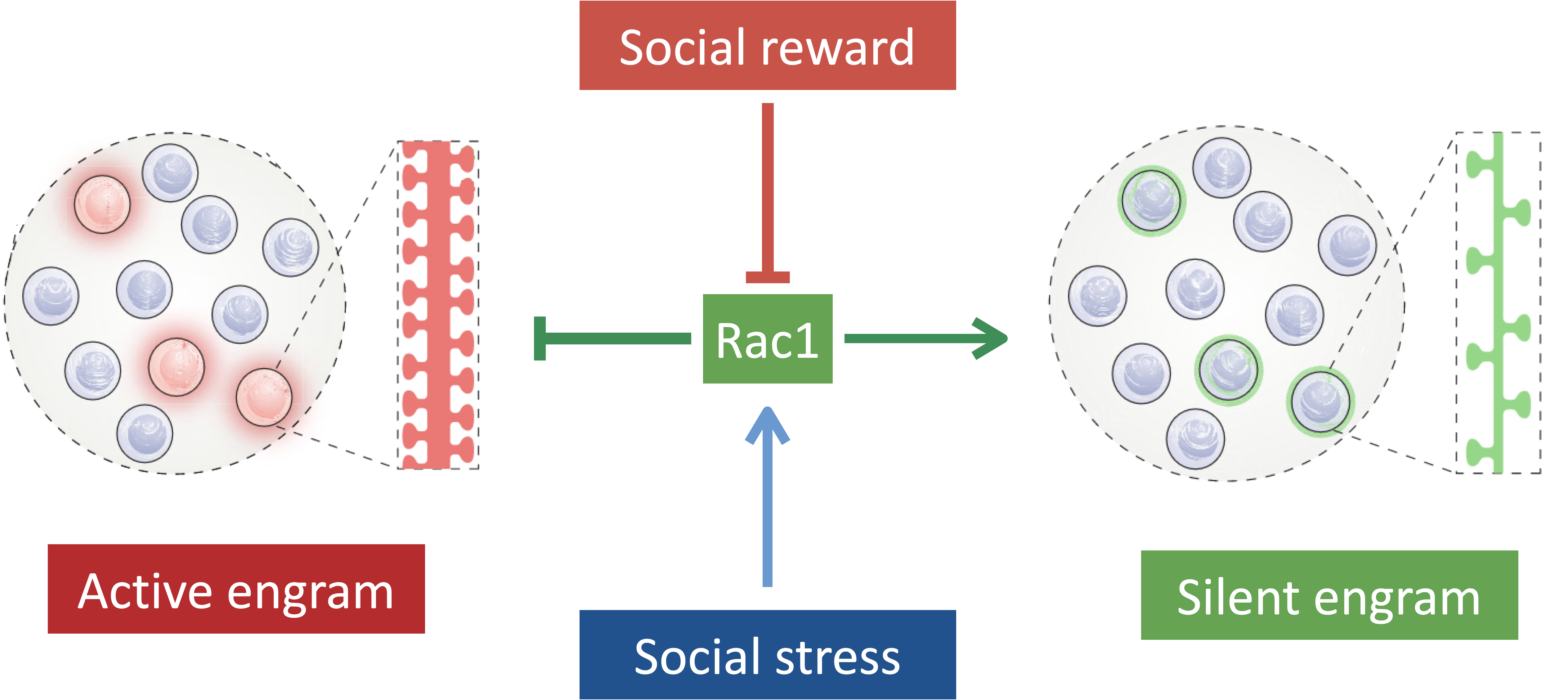近日,beat365官方唯一入口生命科学学院钟毅教授课题组揭示了Rac1-依赖的遗忘机制是情绪状态影响记忆表达的神经基础。在该研究中,课题组聚焦海马体CA1区的记忆痕迹细胞与情绪状态的关系,发现了社交经历引发的情绪可以双向调节记忆痕迹的存储状态,如社交奖励可以将记忆痕迹由沉默态转换为潜伏态,而社交压力可以将记忆痕迹由潜伏态转换为静默态。通过对海马Rac1活性的检测与操纵,我们证明了社交奖励通过抑制海马Rac1、社交压力通过激活海马Rac1来实现记忆痕迹在不同状态之间的转换。如图1所示,该研究提供了一个全新的神经生物学机制来帮助我们理解日常的情绪变化是如何通过切换海马体中的记忆痕迹状态来根据环境变化灵活调节记忆提取的。