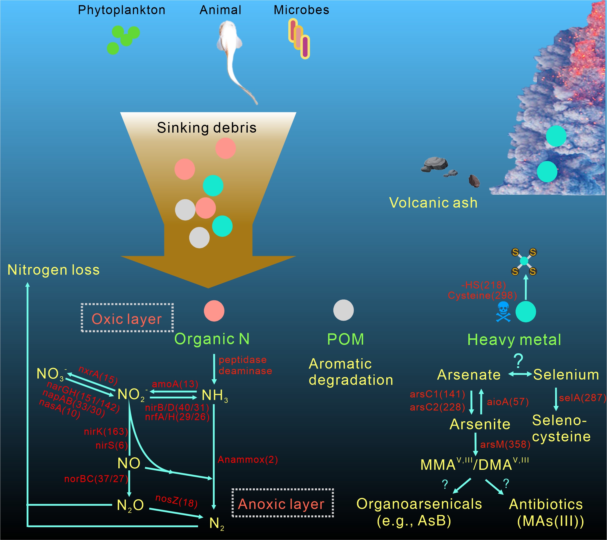 图2 挑战者深渊沉积物中氮和砷循环示意图,括号内数字表示拥有参与氮和砷循环基因的基因组数目