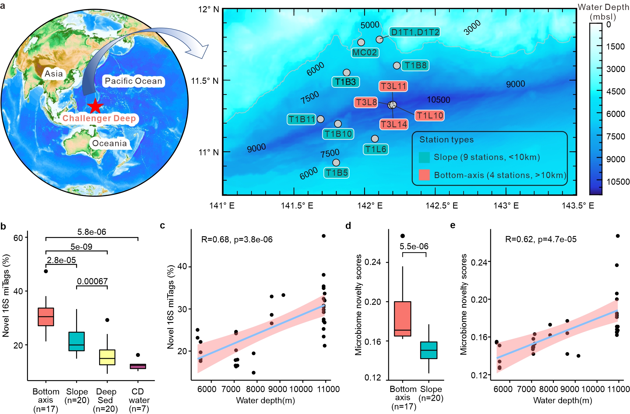 (a. 采样站位; b&c 原核微生物物种新颖性;d&e 原核微生物群落新颖性)