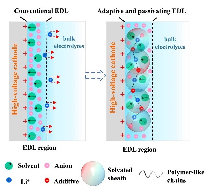 清华新闻网4月20日电 近日,化工系刘凯课题组通过对电解液的分子间作用力调控,突破了常规双电层结构的束缚,在低温快充锂金属电池方面取得重要进展。通过在电解液中加入新颖的“电压刺激响应添加剂”,在充电过程中,其可自发迁移到正极/电解液界面上,并选择性地与阳离子和游离溶剂结合,可以在双电层(EDL)内层形成独特的富含阳离子和支链状的超分子聚合物结构,构筑了一种独特新颖的“富锂离子-贫溶剂”双电层,其具有自适应和钝化特性,显著降低了醚基电解液在高电压正极表面的分解,由此,电池表现出优异的性能,例如超快速充放电和超低温应用,这在传统电解液设计中是很困难的。非常规的EDL结构打破了对经典EDL重排机制的固有认知,极大地提高了器件的电化学性能。
