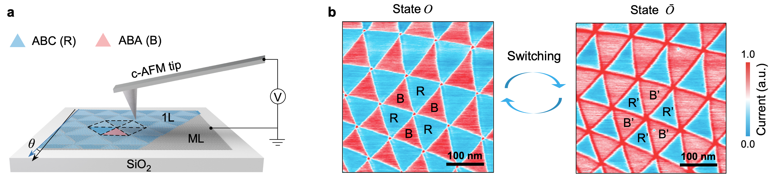 图1.(a)基于导电原子力显微镜(c-AFM)的扭转单-多层石墨烯堆垛表征示意图;(b)两种重构状态的典型电流图像。