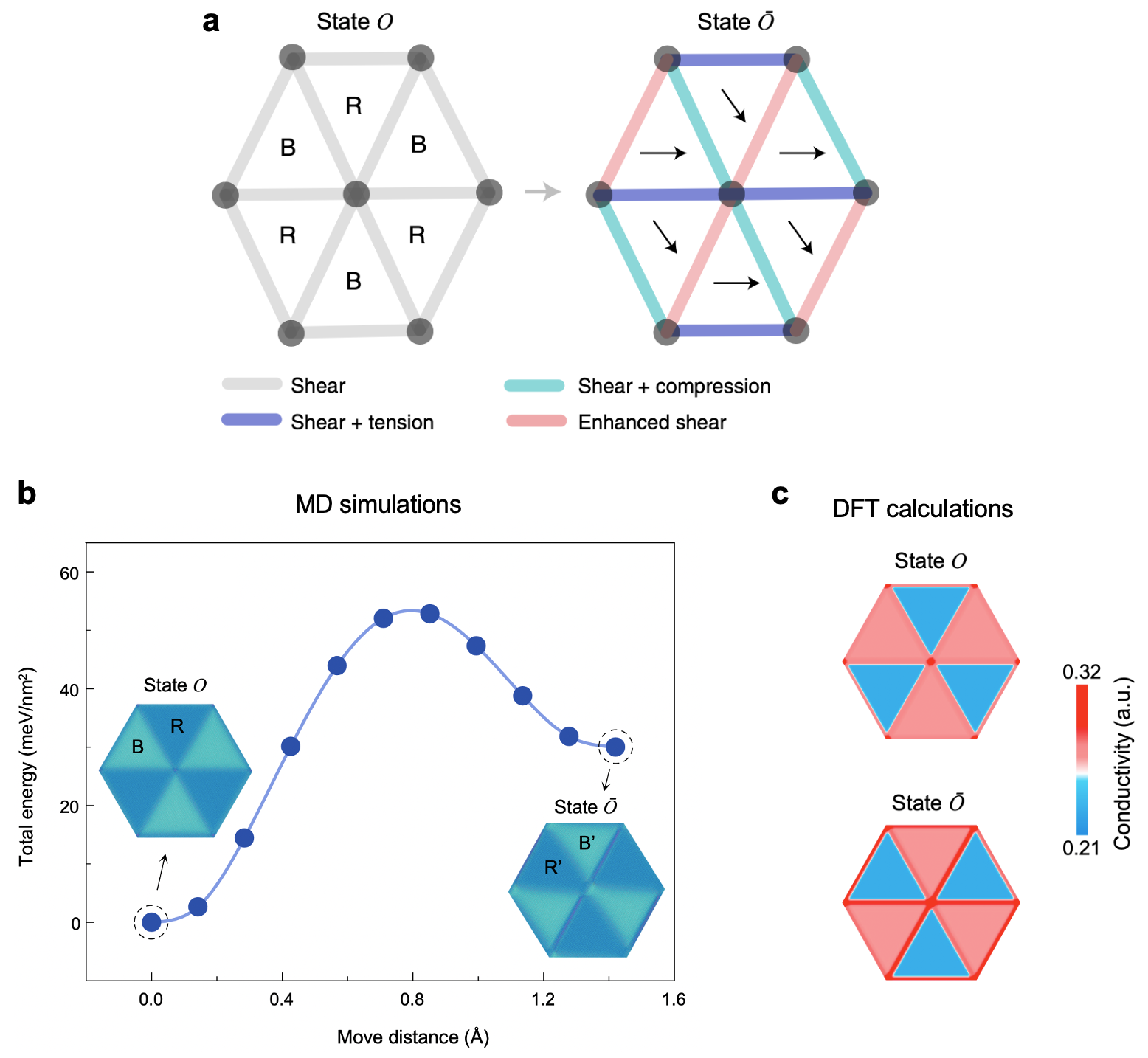 该研究工作中,研究团队借助先前发展的二维材料界面堆垛表征平台,实现了对小扭转角单-多层石墨烯界面堆垛状态的直接实验测量(图1),发现小转角单-多层石墨烯中的堆垛状态呈现如“棋盘”般排列的三角形畴区,不同三角形畴区分别代表不同的堆垛结构,即红色高电导区域对应于ABA堆垛,蓝色低电导区域对应于ABC堆垛(状态O)。更重要的是,通过探针施加力学加载,研究团队观察到重构状态会发生翻转,进入到另外一种稳定的重构状态(状态Ō)。相比于初始重构状态,翻转后的重构状态在畴区内表现出局部相反的导电性对比,并且畴壁区域存在明显增强的导电性(图1)。借助分子动力学模拟、第一性原理计算和前期工作中发展的ACQ电传输模型,揭示了两种重构状态之间的转变可能源于顶层石墨烯在探针扰动下的非均匀面内变形(图2),即顶层石墨烯的非均匀变形导致畴内堆垛结构发生翻转,并且孤子网络的应变状态随之改变。