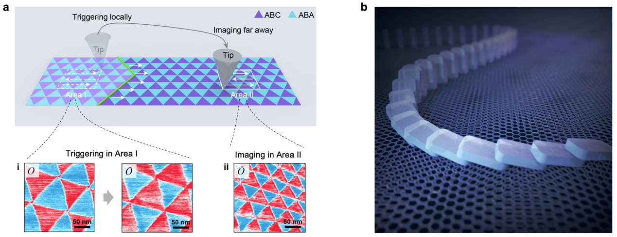 进一步的实验表明,局部堆垛状态的转变可以通过应变孤子网络之间的耦合变形效应进行自发远距离传播(图3)。即在探针施加的局部力学扰动下,畴区内的顶层石墨烯可能发生层间相对滑移,使得局部畴区内的堆垛状态发生改变,而层间石墨烯的局部相对滑动/变形将导致该畴区周边孤子的应变显著增强,为了释放周边孤子较高的应变能,与该孤子相邻畴区内的石墨烯则会自发的移动与变形,使得局部堆垛转变以多米诺骨牌翻转模式进行传播。该工作为理解和调控扭转范德华结构丰富的物理行为提供了一个新思路,也为实现范德华结构中的可控堆垛操控提供了一种新途径。