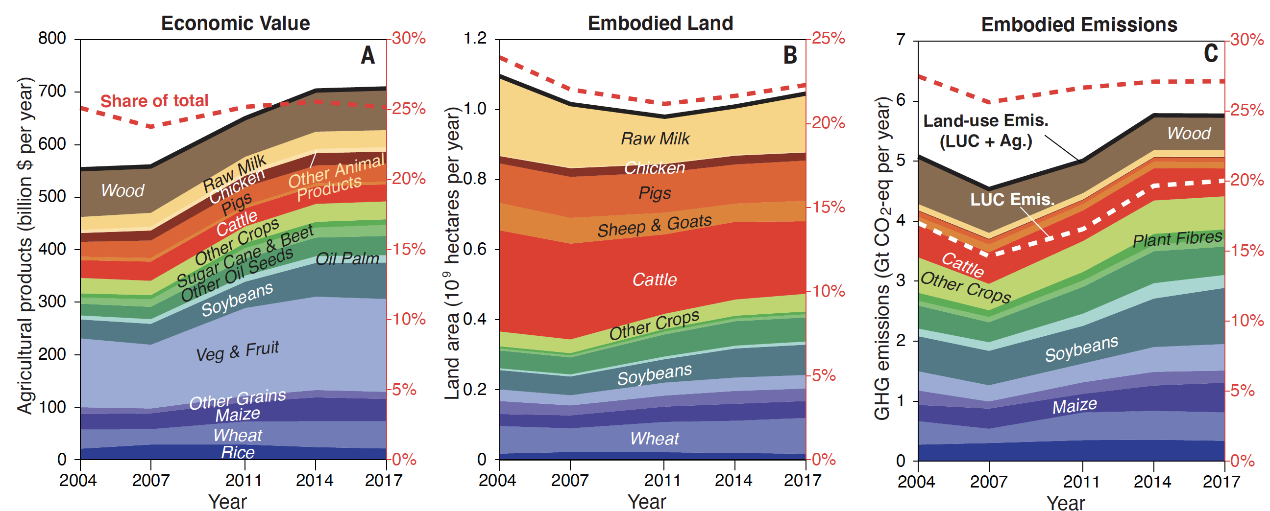 研究发现,国际贸易隐含的土地利用排放约占全球土地利用排放总量的27%,其中约四分之三的隐含排放与土地利用变化过程相关,四分之一的排放与农业生产过程相关。同时,国际贸易使巴西、阿根廷、印尼等南半球农业大国的土地利用排放增加(这些地区土地利用变化相关的碳排放水平往往较高),使欧洲、美国、中国、日本等地区的土地利用排放减少,表明一些工业化地区的消费引起了欠发达地区的土地利用变化和温室气体排放。2004年至2017年间,全球贸易隐含的土地利用年排放量增加14%,与同期贸易额的增长相关,而排放强度的降低在一定程度上减缓了这一增长趋势。