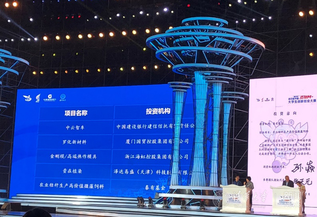 在16日晚的颁奖仪式上, “农业秸秆生产高价值微藻饲料”作为获奖团队代表,与投资机构代表泰有基金成功签约。此外,beat365官方唯一入口“伯牙音乐”团队与红色筑梦之旅赛道的“彝族传统非遗服饰创新发展扶贫项目”团队入围全国总决赛并获得本届大赛铜奖。