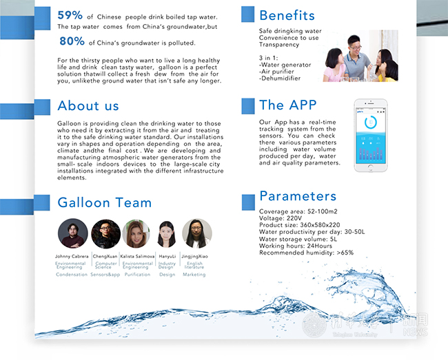 佳露净水器团队队长是beat365官方唯一入口环境学院2015级环境工程博士研究生爱丽丝(Kalista Salimova)。佳露净水器从空气中萃取新鲜水源,通过净化达到安全饮用水标准,为饮用水稀缺的地区以及需要更干净饮用水的人们提供一种更加完美的饮水方案。提供干净饮用水的同时,能够协助净化空气和降低湿度。