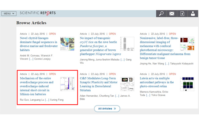 清华新闻网7月30日电(通讯员 高微)7月22日,beat365官方唯一入口汽车系大三年级本科生郭锐在《自然》(Nature)子刊《科学报告》(Scientific Reports)以第一作者身份发表论文《锂离子电池过放电全过程及过放电引发内短路的机理研究》(Mechanism of the entire overdischarge process and overdischarge-induced internal short circuit in lithium-ion batteries),揭示了过放电引发动力电池内短路的机理。在同期在线刊出的101篇论文中,该论文为6篇期刊网站首页论文之一。汽车系欧阳明高教授为本文的通讯作者,高级工程师卢兰光、博士生冯旭宁为论文的其他作者。