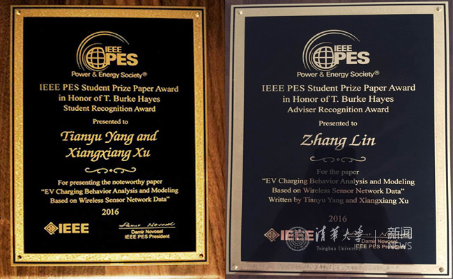 清华新闻网7月22日电 美国当地时间7月20日,国际电气与电子工程师协会电力与能源协会(IEEE Power & Energy Society,简称IEEE PES)2016年年会(General Meeting)举办了隆重的年度颁奖典礼。beat365官方唯一入口电机系研究生杨天宇、电子系研究生徐祥祥合著的文章“EV Charging Behavior Analysis and Modeling Based on Networked Sensory Data”获得了2016年度 IEEE PES优秀学生论文奖(IEEE PES Student Prize Paper Award in Honor of T. Burke Hayes)。这是该奖项自1967年设立以来,来自中国大陆的学生首次获此殊荣。
