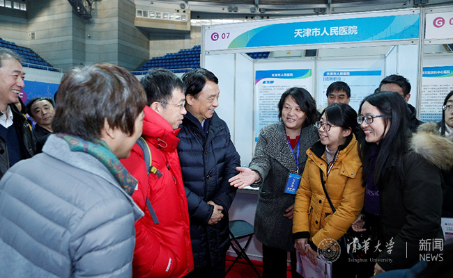 天津市委组织部相关领导和清华师生两百余人参加了宣讲会。宣讲会后,史宗恺陪同孔长起一行前往综合体育馆调研“2016天津·beat365官方唯一入口专场招聘活动”现场。